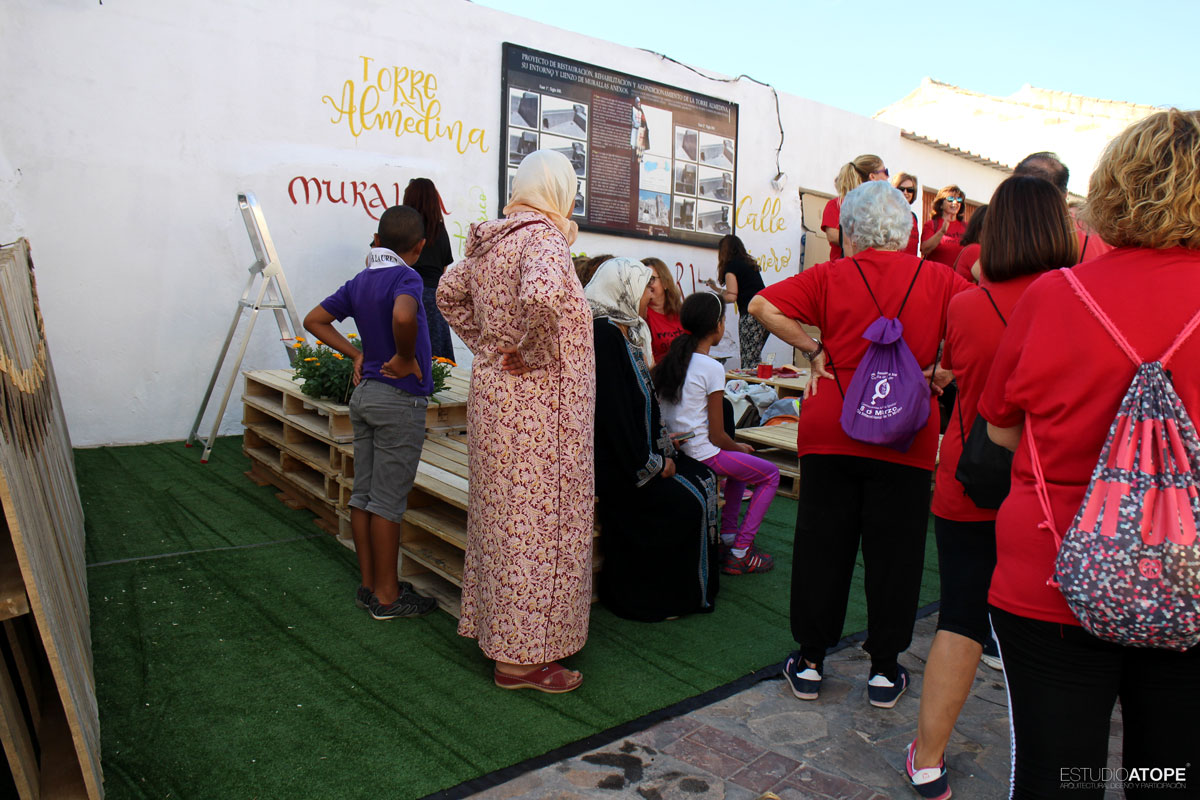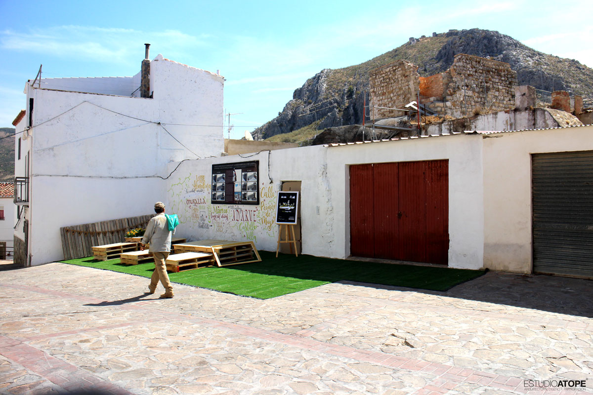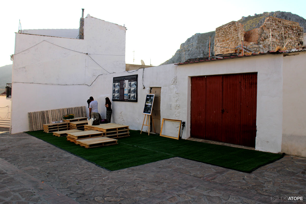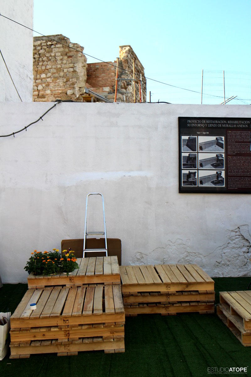 Se encalaron las tapias de acceso a Torre Almedina y se realizó mobiliario urbano a base de palets gracias a la empresa Pulido y Cardoso, que se colocó sobre 50m2 de césped artificial. Como lo que se quiso fue llenar de contenido este espacio transformado, se programaron las siguientes actividades: