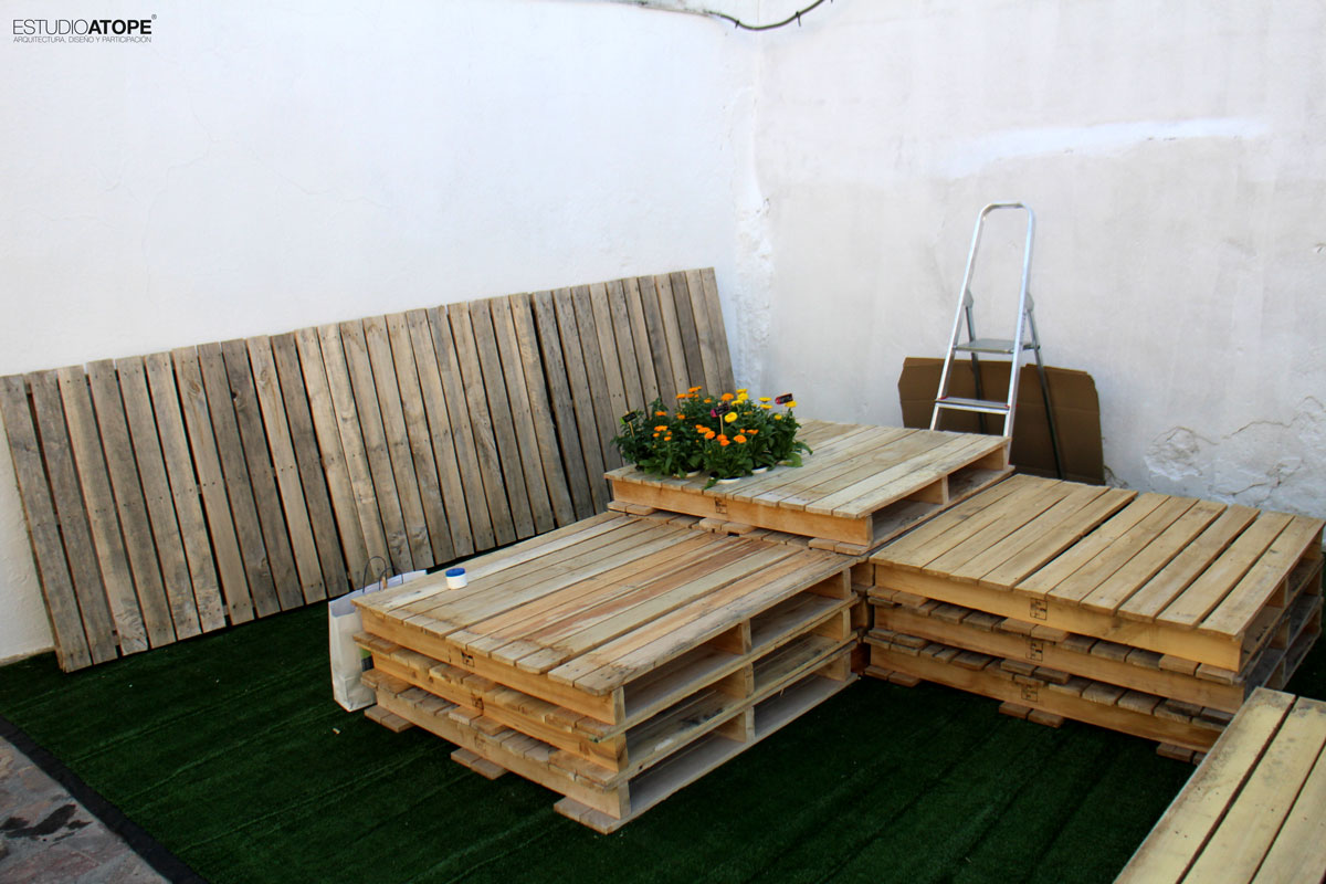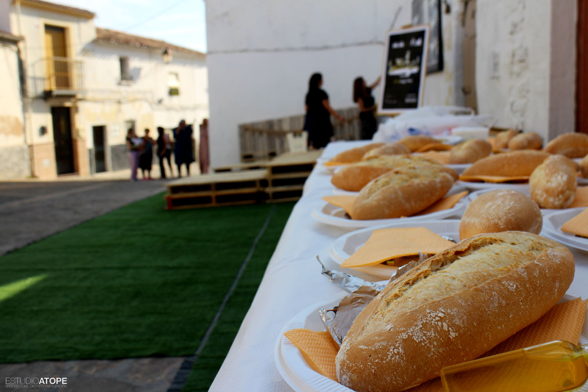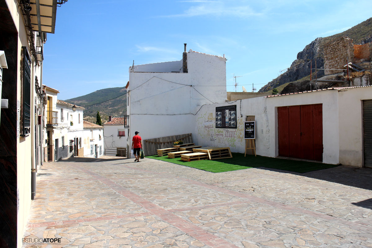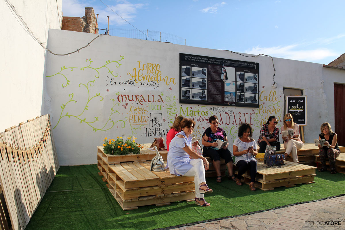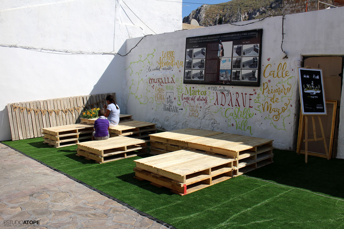 Se encalaron las tapias de acceso a Torre Almedina y se realizó mobiliario urbano a base de palets gracias a la empresa Pulido y Cardoso, que se colocó sobre 50m2 de césped artificial. Como lo que se quiso fue llenar de contenido este espacio transformado, se programaron las siguientes actividades: